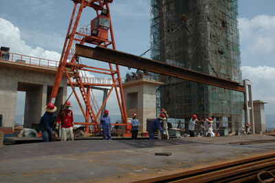 云南山路多,路面窄,產(chǎn)品直徑又很大,為了解決運輸帶來的諸多問題,公司決定由金結(jié)廠派人到現(xiàn)場進(jìn)行筒體制作,盡快滿足用戶需求,F(xiàn)場制作產(chǎn)品相當(dāng)于再造一個生產(chǎn)車間,涉及的環(huán)節(jié)很多,從工地土建、生產(chǎn)設(shè)備的易地安裝、施工資質(zhì)、原材料運輸?shù)絾T工生活起居都要做充分準(zhǔn)備。去年冬至,金結(jié)廠廠長王超生遠(yuǎn)赴云南和廠家進(jìn)行協(xié)商溝通,今年二三月份,項目經(jīng)理朱立功、施工隊長顧立軍、設(shè)備員周曉明等人又先后到云南,克服了難以想象的困難,完成了前期準(zhǔn)備工作,保證了5月初開始正式施工。公司金結(jié)廠員工盧會平、張海明、程喜文、韓道成、吳忠科等人一去大半年,一直沒有回過家。工地上來來往往幾批人,最多時有15人在同時生產(chǎn)。由于工地生活用水困難,他們只能租住在離工地18公里的地方,晚上守著只能看一套節(jié)目的彩電,一大早還要匆匆忙忙往工地趕。為了趕工期,他們白天晚上兩班生產(chǎn),午餐就在工地上吃。